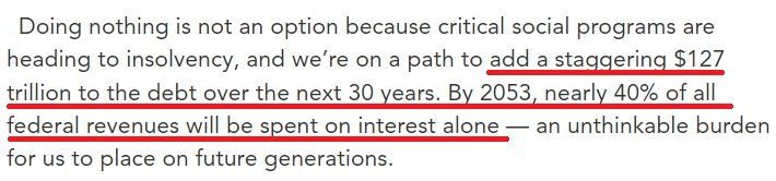 根據(jù)該智庫的預(yù)測(cè),美國在未來30年將在現(xiàn)有基礎(chǔ)上再增加127萬億美元債務(wù);到2053年,光是利息成本就要用掉近40%的聯(lián)邦財(cái)政收入。