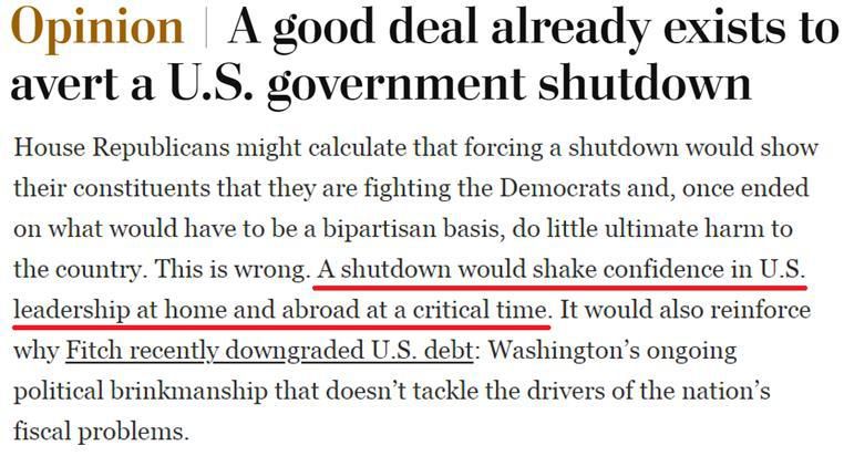 有美媒評(píng)論指出,政府關(guān)門將動(dòng)搖國內(nèi)外對(duì)美國領(lǐng)導(dǎo)層的信心,而這也將進(jìn)一步坐實(shí)國際評(píng)級(jí)機(jī)構(gòu)對(duì)美國信用“降級(jí)”的原因:華盛頓持續(xù)的政治脅迫政策無法解決日益惡化的財(cái)政問題。