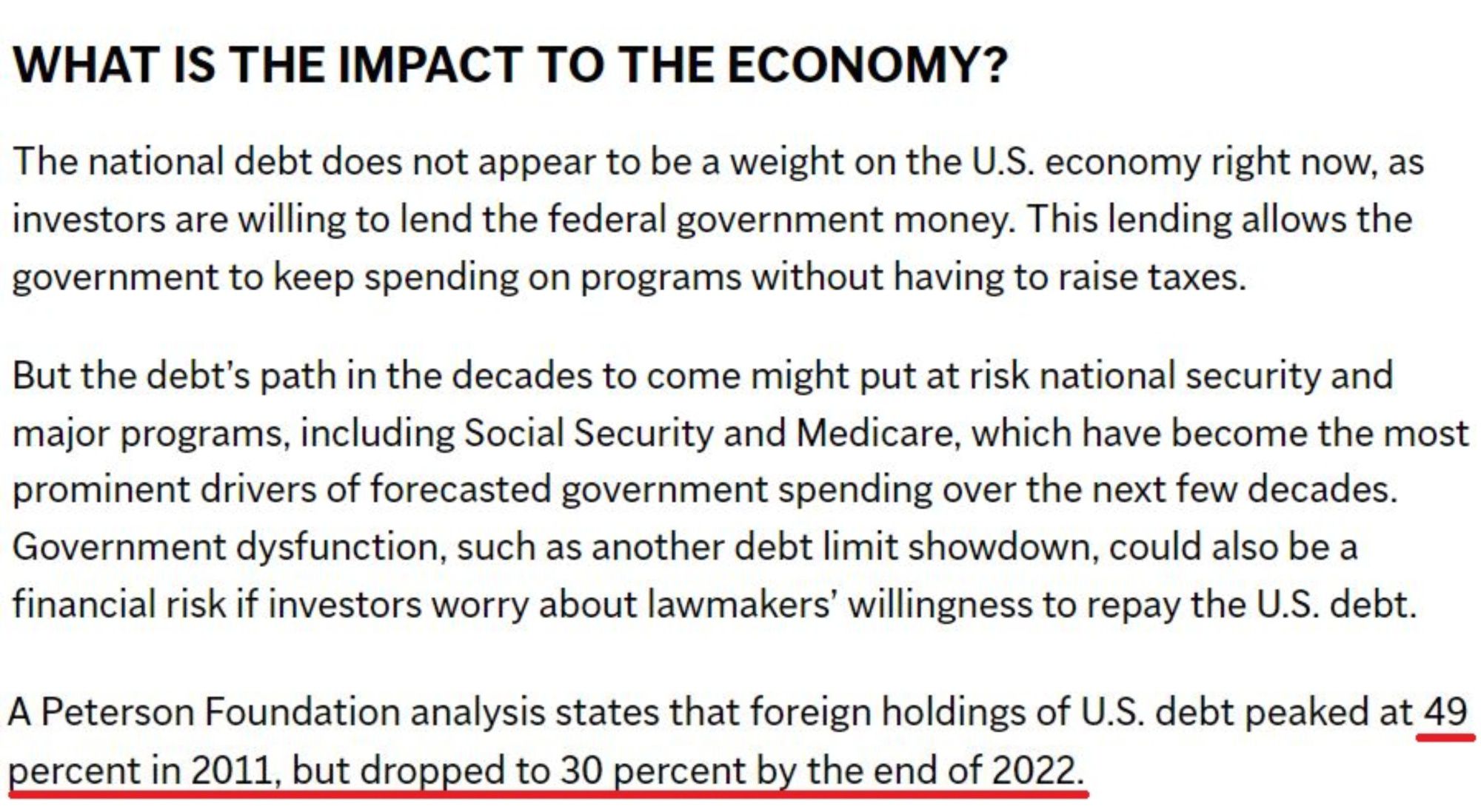 事實(shí)上,美國國會(huì)黨爭(zhēng)和政府功能失調(diào)引發(fā)的多次債務(wù)上限之爭(zhēng)和債務(wù)違約險(xiǎn)情,已迫使國際買家紛紛減持美國國債。根據(jù)彼得森基金會(huì)的數(shù)據(jù),海外投資者所持美債份額在2011年曾達(dá)到49%的峰值,但到2022年底已降至30%。