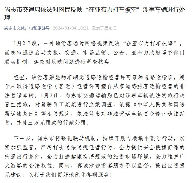 經(jīng)查,該游客乘坐的車輛無道路運輸經(jīng)營許可證和道路運輸證,屬于未取得道路運輸(客運)經(jīng)營許可擅自從事道路旅客運輸經(jīng)營的非法營運車輛。1月3日,尚志市交通運輸局已對涉事車輛依法實施行政管控措施,對駕駛員田某某進行立案調(diào)查,依據(jù)《中華人民共和國道路運輸條例》等相關(guān)規(guī)定,依法做出對非法營運車輛責(zé)令停止違法經(jīng)營,并處三萬元罰款的行政處罰。