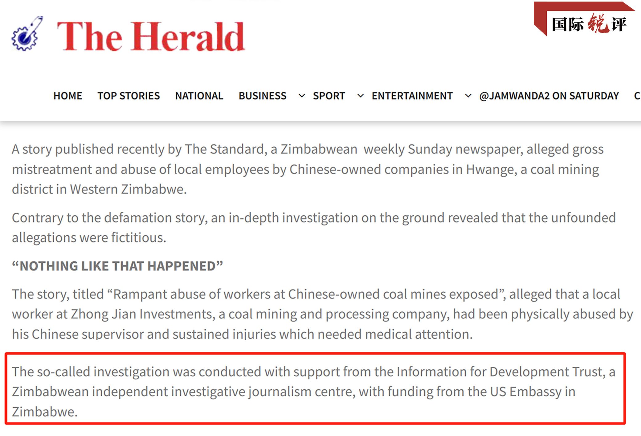 2022年5月,津巴布韋媒體《標(biāo)準(zhǔn)報》發(fā)布了一篇報道,污蔑中國礦企虐待當(dāng)?shù)貑T工,稱這名員工“受傷送醫(yī),還被解雇了”。這家媒體稱,報道是和津巴布韋一個名叫“信息促進(jìn)發(fā)展信托基金(IDT)”的機(jī)構(gòu)合作完成的。然而很快,津巴布韋《先驅(qū)報》就發(fā)文,用大量事實證明,這名員工只是和中方員工發(fā)生了小口角,并沒有被毆打,也沒有被解雇。