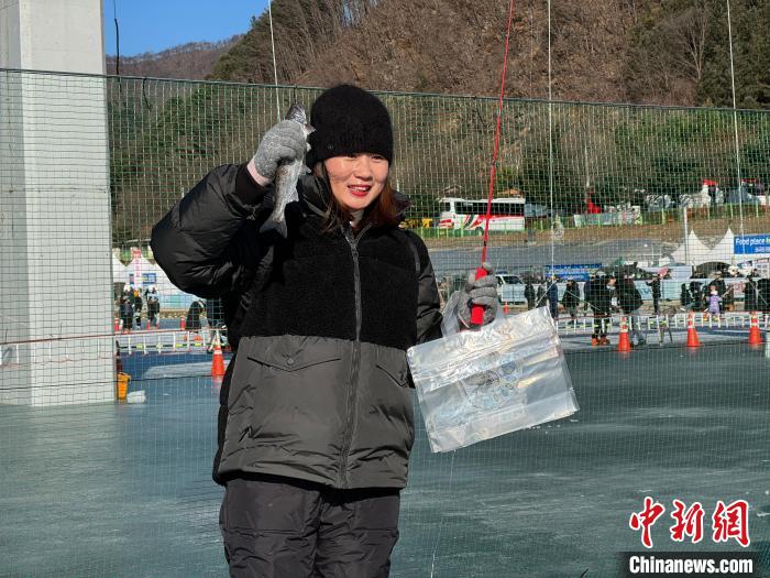 記者在慶典現(xiàn)場看到,特色冰釣場上擠滿游客。男女老少都把魚竿垂到冰面上事先鑿好的釣洞里,上下擺動魚竿來吸引冰下游動的山鱒魚,沉浸在冰釣的樂趣之中。游客還可以將釣到的魚拿到冰場附近的烤場現(xiàn)烤、現(xiàn)吃。據(jù)悉,今年主辦方從韓國各地的養(yǎng)殖場空運來160噸山鱒魚,滿足游客抓魚、釣魚需求。