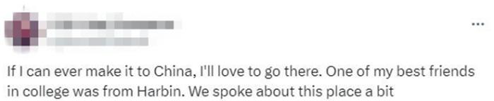 有網(wǎng)友表示,“如果我能去中國,我很想去那里。我大學時最好的一個朋友就是來自哈爾濱。我們聊過這個地方?!?/p>