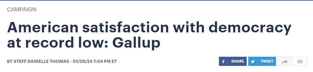 從不同的黨派來看,對美國民主感到滿意的民主黨人比例為38%,高于共和黨人的17%以及獨立人士的27%。值得注意的是,自2021年該民調(diào)問題推出以來,這三個群體對美國民主的滿意度均有程度不小的下降。