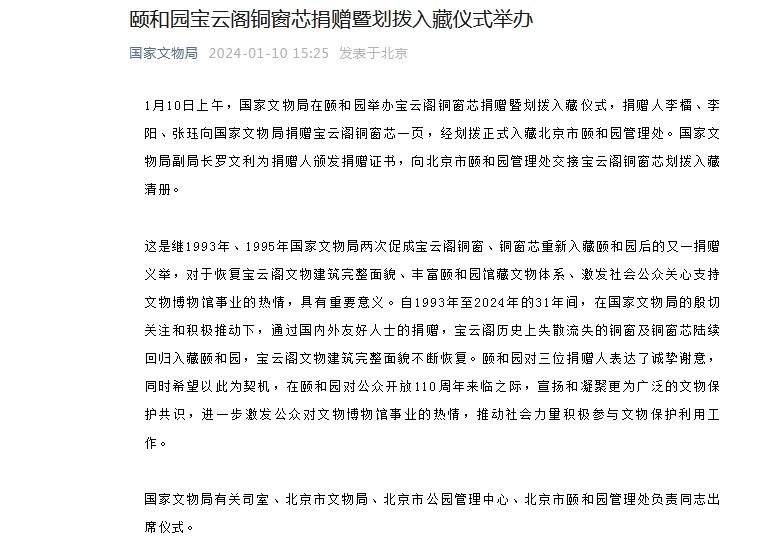 這是繼1993年、1995年國家文物局兩次促成寶云閣銅窗、銅窗芯重新入藏頤和園后的又一捐贈(zèng)義舉,對(duì)于恢復(fù)寶云閣文物建筑完整面貌、豐富頤和園館藏文物體系、激發(fā)社會(huì)公眾關(guān)心支持文物博物館事業(yè)的熱情,具有重要意義。自1993年至2024年的31年間,在國家文物局的殷切關(guān)注和積極推動(dòng)下,通過國內(nèi)外友好人士的捐贈(zèng),寶云閣歷史上失散流失的銅窗及銅窗芯陸續(xù)回歸入藏頤和園,寶云閣文物建筑完整面貌不斷恢復(fù)。頤和園對(duì)三位捐贈(zèng)人表達(dá)了誠摯謝意,同時(shí)希望以此為契機(jī),在頤和園對(duì)公眾開放110周年來臨之際,宣揚(yáng)和凝聚更為廣泛的文物保護(hù)共識(shí),進(jìn)一步激發(fā)公眾對(duì)文物博物館事業(yè)的熱情,推動(dòng)社會(huì)力量積極參與文物保護(hù)利用工作。