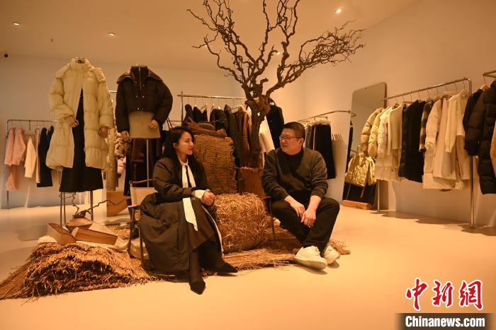 1月4日,許智偉(右一)和妻子在自家品牌店的“樣板間”內(nèi)。張旭 攝