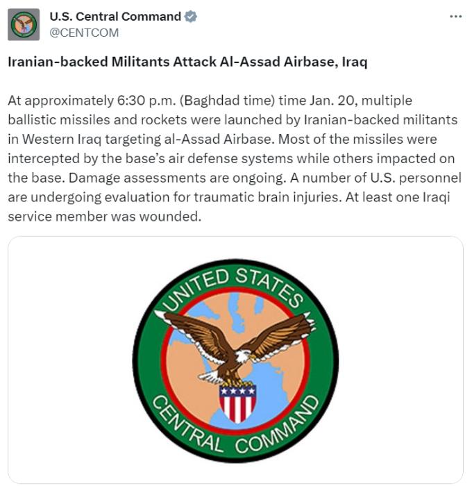 據(jù)報(bào)道,美國(guó)中央司令部在一份聲明中稱,伊朗支持的武裝分子20日在伊拉克西部,向阿薩德空軍基地發(fā)射了多枚彈道導(dǎo)彈和火箭彈,其中大部分導(dǎo)彈被基地的防空系統(tǒng)攔截,其他則擊中了基地。