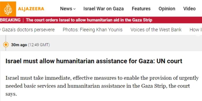 卡塔爾半島電視臺(tái)稱,國(guó)際法院責(zé)成以色列采取更多措施保護(hù)巴勒斯坦人,但沒(méi)有命令其結(jié)束在加沙地帶的軍事行動(dòng)。此外,國(guó)際法院要求以色列在一個(gè)月內(nèi)就其已采取的行動(dòng)向國(guó)際法院提交報(bào)告。