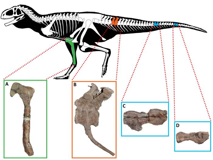 受病變影響的巴塔哥尼亞阿貝力龍骨骼。A.柯氏基爾梅龍右脛骨內(nèi)側視圖;B.加氏奧卡龍的第5和第6尾椎骨及第5脈弓左側視圖;C和D為迷霧嚙王龍的中和后尾椎骨左側視圖(圖片來自Ales)。施普林格·自然/供圖