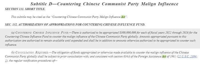 具體內(nèi)容為:“授權(quán)在2022年至2026年的每個財政年度,為‘對抗中國影響力基金’撥款3億美元,以對抗中國共產(chǎn)黨在全球的惡意影響。”
