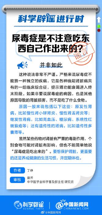 中新網(wǎng)2月7日電 近日有人稱(chēng):“中國(guó)尿毒癥透析患者已經(jīng)超過(guò)100萬(wàn)了,尿毒癥是不注意吃東西自己作出來(lái)的,要想不得尿毒癥,有些食物不能碰……”注意,這些說(shuō)法沒(méi)有科學(xué)依據(jù)!嚴(yán)格來(lái)說(shuō)尿毒癥并不能算一種獨(dú)立的疾病,它是各種晚期腎臟病共有的一組臨床綜合征,提示腎功能衰竭進(jìn)入終末階段。如果非要說(shuō)尿毒癥的病因的話(huà),也是其他原因?qū)е碌哪I臟損害,而不是吃了什么食物。要想保護(hù)腎臟,更重要的還是養(yǎng)成健康的生活習(xí)慣,并定期體檢。(來(lái)源:@科學(xué)辟謠 中國(guó)新聞網(wǎng)微博)
