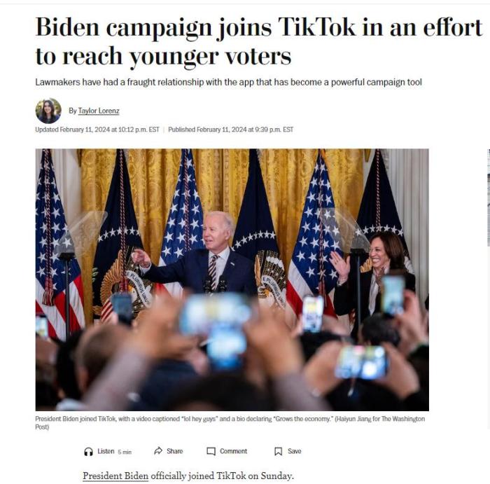 美國(guó)《華盛頓郵報(bào)》分析稱,拜登團(tuán)隊(duì)正在努力采取措施來(lái)試圖與年輕人建立聯(lián)系。比如,其在TikTok上的頭像是一張眼睛放射激光的照片。對(duì)此,Z世代內(nèi)容創(chuàng)作者亞倫·帕納斯指出:“全國(guó)各地的年輕人一直在等待這一刻。”