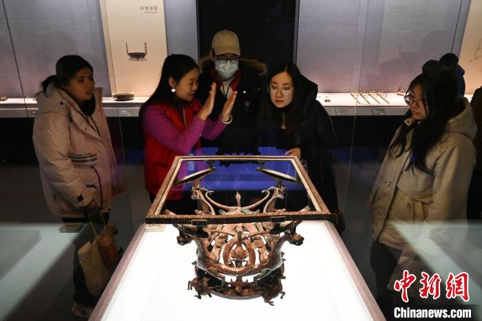 2月6日,民眾在河北博物院“戰(zhàn)國(guó)雄風(fēng) 古中山國(guó)”展廳參觀錯(cuò)金銀四龍四鳳銅方案座?!≈行律缬浾?翟羽佳 攝