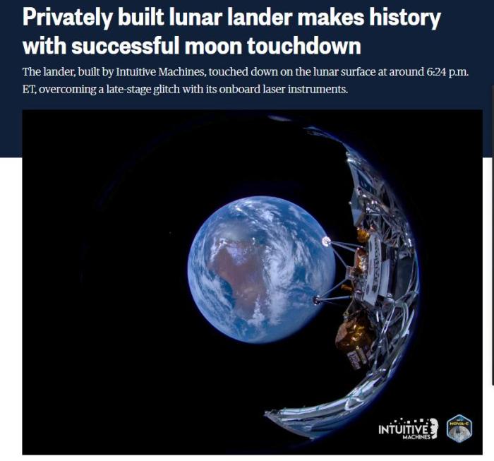據(jù)報道,由“直覺機(jī)器” 研發(fā)的著陸器于美東時間下午6點23分左右降落在月球表面。該著陸器是自1972年“阿波羅17號”任務(wù)以來第一艘登上月球的美國航天器。