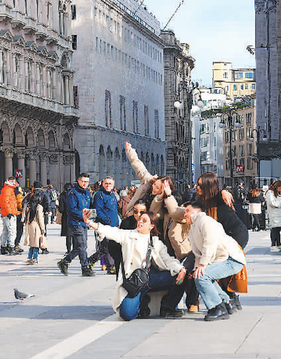 意大利米蘭市中心,中外游客在景點前擺造型拍合影。