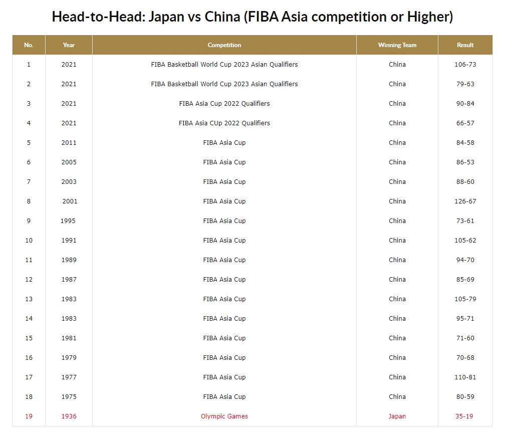 據(jù)國際籃聯(lián)統(tǒng)計(jì),自1936年奧運(yùn)會(huì)以來,中國男籃從未在FIBA國際籃聯(lián)舉辦的亞洲杯及更高級(jí)別比賽中負(fù)于日本男籃。