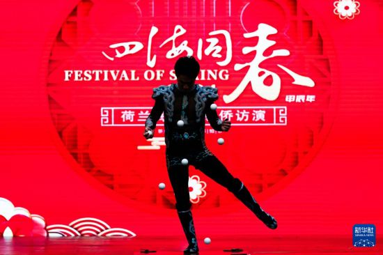 2月22日,演員在荷蘭阿姆斯特丹舉行的“四海同春”慰?jī)S訪演活動(dòng)上表演雜技。新華社記者 孟鼎博 攝