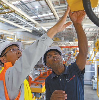 中國(guó)和南非兩國(guó)員工在南非東開(kāi)普省北汽南非工廠焊裝車間內(nèi)工作。