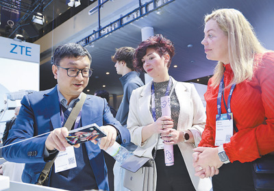 在中興通訊展廳,工作人員向參觀者介紹最新產(chǎn)品。