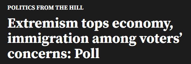 調(diào)查發(fā)現(xiàn),21%的受訪者表示“政治極端主義或者民主所受到的威脅”是他們最為擔(dān)心的問題,其次才是經(jīng)濟問題和移民問題,后兩者占比分別為19%和18%。