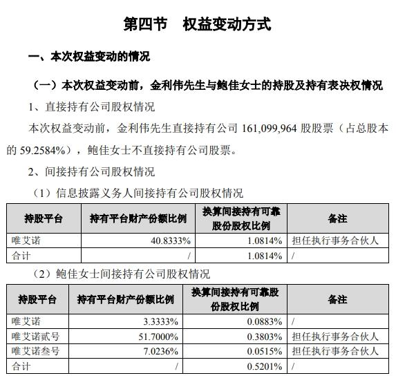 公告顯示,金利偉和鮑佳持有的唯艾諾、唯艾諾貳號、唯艾諾叁號三家合伙企業(yè)的財產(chǎn)份額由雙方均等分割,各占一半。唯艾諾貳號、唯艾諾叁號的執(zhí)行事務(wù)合伙人將變更為金利偉。變更后,三家合伙企業(yè)的執(zhí)行事務(wù)合伙人均為金利偉。