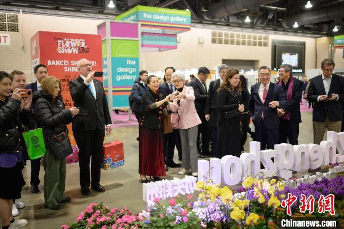 當(dāng)?shù)貢r間3月2日,一年一度的費城花展在美國賓夕法尼亞州費城開幕,以“功夫鄭州——花俏嵩山”為主題的鄭州展園當(dāng)天在花展上亮相。圖為中國駐紐約總領(lǐng)事黃屏(右三)帶領(lǐng)嘉賓參觀鄭州展園?!ranck Zhou 攝