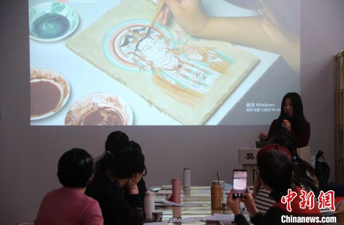 2023年2月,在敦煌研究院莫高學(xué)堂,研學(xué)導(dǎo)師給學(xué)員講授敦煌壁畫臨摹技法?! 垥粤?攝
