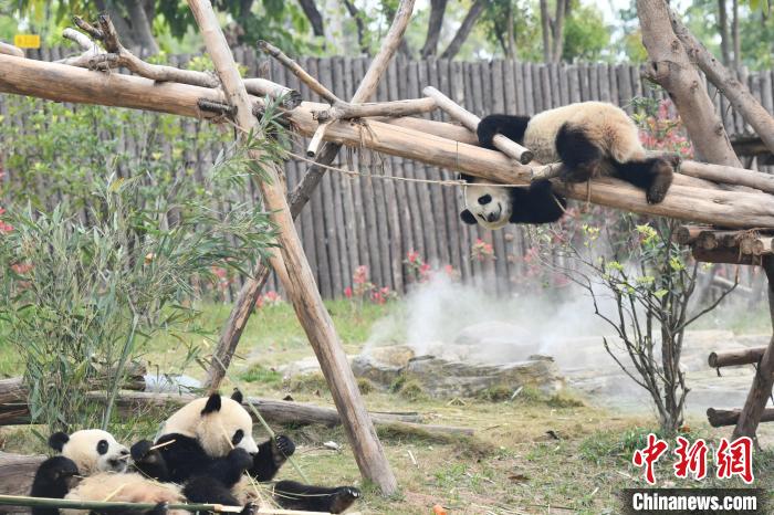 2023年3月31日,四川省成都市,成都大熊貓繁育研究基地內的一只大熊貓爬上樹干探出腦袋,仿佛在與同伴玩游戲。中新社記者 張浪 攝