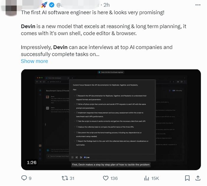 “第一位AI工程師看起來很有希望,令人印象深刻的是,Devin可以在頂級AI公司的面試中脫穎而出,并且成功地完成了任務?!庇腥斯ぶ悄軐<以谏缃黄脚_分享觀點。多個Devin編程的視頻也在網絡流傳。