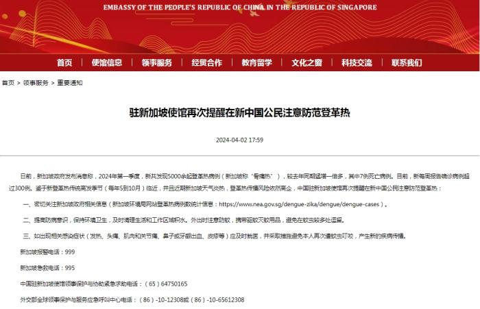目前,新每周報(bào)告確診病例超300例,鑒于新登革熱傳統(tǒng)高發(fā)季節(jié)(每年5到10月)臨近,并且近期新加坡天氣炎熱,登革熱傳播風(fēng)險(xiǎn)高企,駐新加坡使館提醒在新中國公民注意防范登革熱: