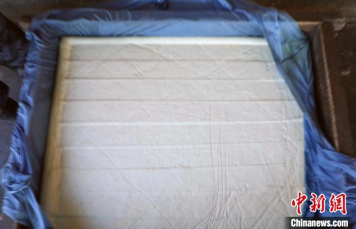 豆?jié){與石膏相遇,化學(xué)反應(yīng)后,豆香味縈繞在鼻尖,香氣彌漫在空氣中。這時(shí),王志勇蓋上空隙均勻的木頭壓板,壓上石墩子,讓豆腐腦中的水分通過籠布和蓋板上的洞流走,等待豆腐壓好成型。