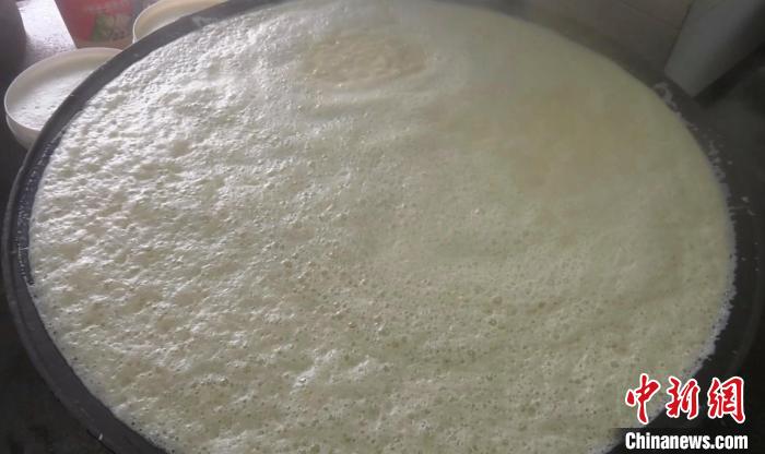 煮豆?jié){時(shí),一口可以裝滿200公斤豆?jié){的鐵鍋,被一點(diǎn)點(diǎn)地裝滿,綿密的泡沫溢滿了整個(gè)鐵鍋,爐灶中的柴火通過燃燒散發(fā)出獨(dú)有的清香。
