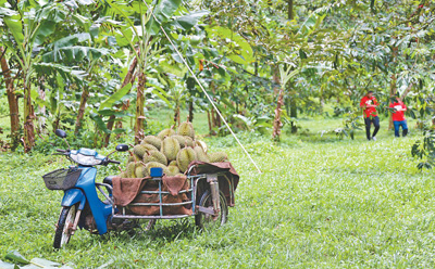 在泰國(guó)南部春蓬府的一家榴蓮種植園,工人將采摘下來(lái)的榴蓮裝到車(chē)上準(zhǔn)備運(yùn)出。