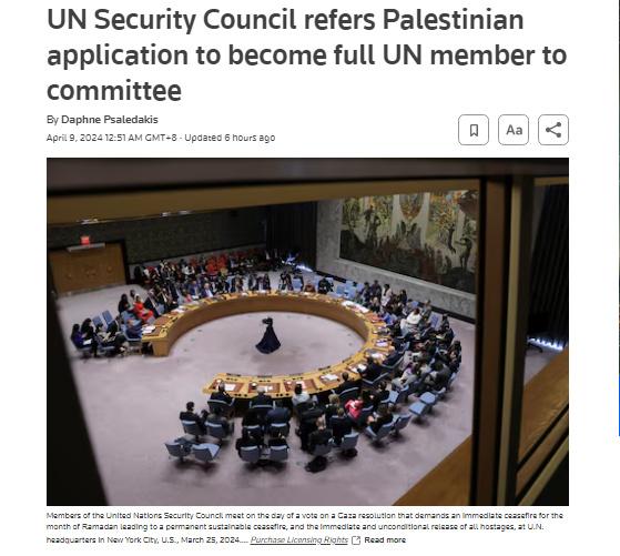 中新網(wǎng)4月9日電 據(jù)路透社報道,當?shù)貢r間4月8日,聯(lián)合國安理會將巴勒斯坦成為聯(lián)合國正式會員國的申請?zhí)峤话怖頃鲁蓡T接納委員會。