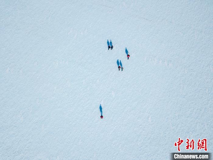 藍(lán)冰上的科學(xué)家、野外向?qū)Ш陀浾摺U掌瑪z于智利南極研究所(INACH)2022年對南極洲埃爾斯沃斯山脈聯(lián)合冰川的實(shí)地考察(圖片來自智利圣地亞哥大學(xué)Jose Jorquera)。施普林格·自然/供圖