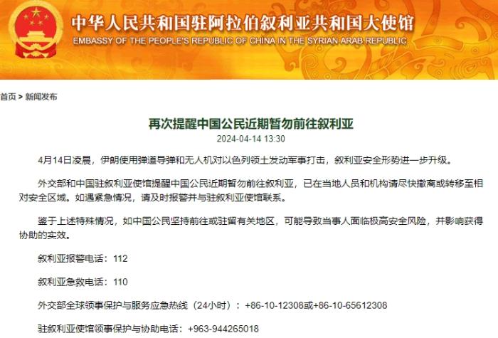 使館消息稱,4月14日凌晨,伊朗使用彈道導(dǎo)彈和無人機(jī)對(duì)以色列領(lǐng)土發(fā)動(dòng)軍事打擊,敘利亞安全形勢(shì)進(jìn)一步升級(jí)。