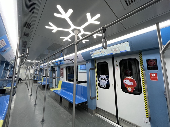 登上車廂,隨處可見冬奧元素。車頂的燈帶不再單調,而是被設計成了雪花的形狀,車廂扶手也融入了冰球桿的設計。而在車門上,北京冬奧會吉祥物“冰墩墩”和“雪容融”仿佛在和乘客們招手。