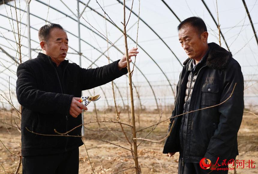 河北省邢臺(tái)市廣宗縣“黨員種植能手”(左一)為北塘疃鎮(zhèn)南寺郭村村民培訓(xùn)修剪技術(shù)。 梁智曉攝