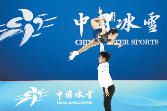 中國(guó)花樣滑冰運(yùn)動(dòng)員隋文靜和韓聰在訓(xùn)練中。本報(bào)記者 劉平攝