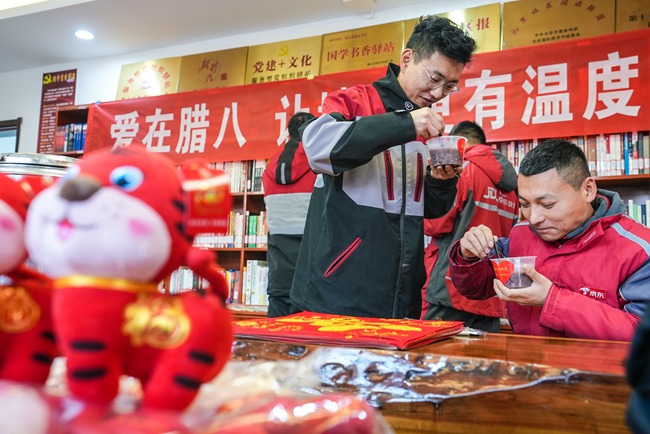 人民網(wǎng)北京1月8日(池夢蕊 閆兆松)1月7日,盡管天氣非常寒冷,但是在位于順義區(qū)勝利街道建北一社區(qū)的“小哥驛站”里卻是歡聲笑語、暖意洋洋。原來,由順義區(qū)勝利街道非公企業(yè)聯(lián)合會黨支部、建北一社區(qū)黨總支聯(lián)合舉辦的“愛在臘八,讓城市更有溫度”主題活動正在這里暖心舉行。一碗碗熱氣騰騰、香甜四溢的臘八粥為正在這里臨時休息的快遞小哥送去濃濃的關(guān)愛。勝利街道工委副書記、辦事處主任張家豐、工委副書記薛靜、組織部長石曉靜、建北一社區(qū)黨總支書記顧濤以及夏禾拉面、更讀書社、順批醫(yī)藥等愛心單位代表參與了本次公益活動。