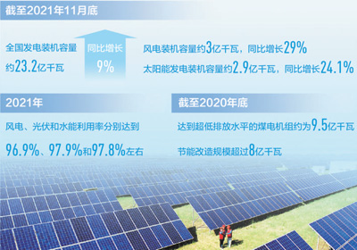 近年來,我國風(fēng)電、光伏等可再生能源裝機(jī)規(guī)模持續(xù)擴(kuò)大。截至2021年11月底,全國發(fā)電裝機(jī)容量約23.2億千瓦,同比增長9%。其中,風(fēng)電裝機(jī)容量約3億千瓦,同比增長29%;太陽能發(fā)電裝機(jī)容量約2.9億千瓦,同比增長24.1%。