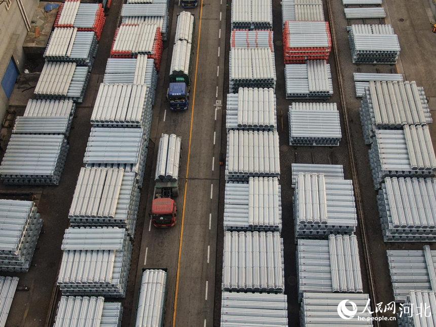 在河北省唐山市豐南區(qū)一家鍍鋅鋼管企業(yè)成品鍍鋅鋼管存放點(diǎn),貨車(chē)滿載管材準(zhǔn)備發(fā)車(chē)。崔光攝