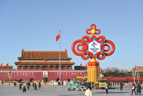 昨天,天安門廣場又添新景。一個(gè)鑲嵌有2022冬奧會(huì)會(huì)徽的巨型中國結(jié)正在安裝。中國結(jié)整體呈紅色,中心鑲嵌一片藍(lán)白相間的雪花,雪花正中是2022冬奧會(huì)會(huì)徽,為迎接春節(jié)和冬奧營造喜慶氛圍。 本報(bào)記者 鄧偉攝