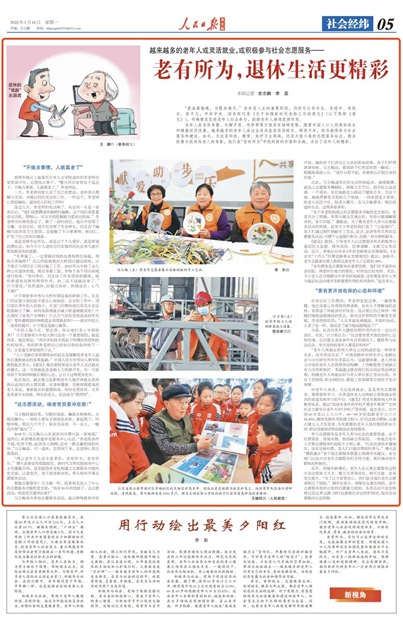 老年人在言傳身教、化解矛盾、傳幫帶等方面具有獨(dú)特優(yōu)勢(shì)。隨著中國(guó)人口人均壽命延長(zhǎng)和健康狀況改善,越來(lái)越多的老年人由過(guò)去退休在家休閑娛樂(lè)、頤養(yǎng)天年,轉(zhuǎn)為繼續(xù)參與社會(huì)服務(wù)和建設(shè)。如今,無(wú)論是科技、教育、醫(yī)療衛(wèi)生領(lǐng)域,還是大街小巷的志愿服務(wù)站點(diǎn),都活躍著大批退休老人的身影,他們?cè)凇袄嫌兴鶠椤敝姓业叫碌膬r(jià)值和樂(lè)趣,活出了老年人的精彩。