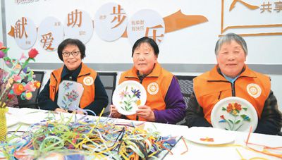 馬玉梅(左)等老年志愿者展示準(zhǔn)備捐獻(xiàn)的手工藝品。 李 樂(lè)攝