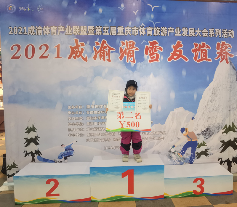 2021年夏天,萱萱迎來了第一場(chǎng)比賽——成渝滑雪友誼賽女子少年(U12)組比賽。當(dāng)時(shí)4歲的萱萱是全場(chǎng)最小的參賽者,其他和她同臺(tái)角逐的都是8到12歲的小朋友。在平行回轉(zhuǎn)和坡面障礙兩個(gè)項(xiàng)目中,萱萱捧回了兩個(gè)第二名。