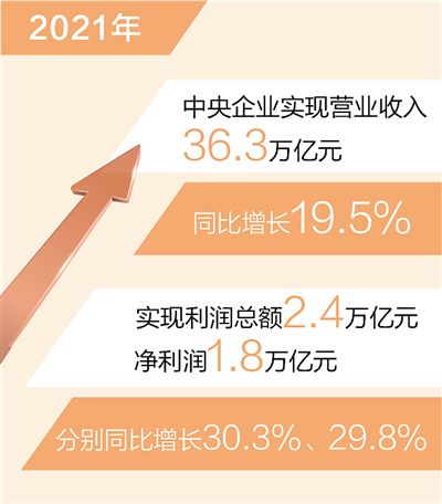 本報北京1月19日電 (記者劉志強)記者從國務院國資委了解到:去年中央企業(yè)經(jīng)營規(guī)模、經(jīng)濟效益和運行質(zhì)量保持穩(wěn)中向好、快中提質(zhì),為我國經(jīng)濟發(fā)展作出重要貢獻。2021年,中央企業(yè)實現(xiàn)營業(yè)收入36.3萬億元,同比增長19.5%,兩年平均增長8.2%;實現(xiàn)利潤總額2.4萬億元、凈利潤1.8萬億元,分別同比增長30.3%、29.8%,兩年平均增速分別為14.5%、15.3%。營業(yè)收入、利潤總額、凈利潤等主要指標均創(chuàng)歷史最好水平。
