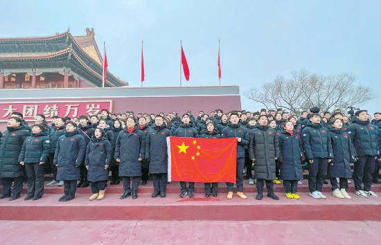 在天安門廣場觀看升國旗儀式后 北京冬奧會中國健兒宣誓出征