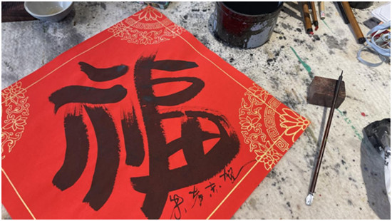 朱者赤是去年7月入駐藝術(shù)村的自由職業(yè)藝術(shù)家,今年,他決定留在林家村過年,他希望以送“?!钡姆绞絹肀磉_自己真摯的祝福,與村民們一起歡度春節(jié)。581幅各不相同的藝術(shù)“?!弊郑撬徒o村中581戶家庭的新年禮物?!叭腭v半年來,政府部門的關(guān)心幫助和支持與村民們熱情地問候讓我非常感動,我懷著感恩的心情,寫下這581個創(chuàng)意福字。”朱者赤說。
