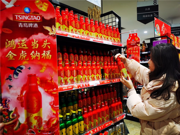 而青島啤酒“百年之旅“憑借獨(dú)一無二的珍惜原材、不惜工本的耗時慢釀、與無與倫比的琥珀原色和恒久回味,也在春節(jié)超高端市場上有叫好叫座。”去年走訪客戶就送的‘百年之旅’,有特色又有排面,客戶反饋特別好,今年特地團(tuán)購一批,公司年會聚餐也喝他?!澳惩赓Q(mào)公司采購部的劉先生,正在和超市的經(jīng)理談大宗采購,作為青島”特產(chǎn)“的青島啤酒,是他們每年過年的首選禮品,”還有今年推出虎年版的百年鴻運(yùn),特別新年應(yīng)景,配上特有的搖擺蓋開起來特別有氣氛,喜慶?!?/p>